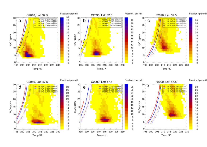 CLaMS box-model simulations are used to calculate chlorine activation thresholds, which determine temperatures and water vapour mixing ratios leading to heterogeneous chlorine activation for a specific trace gas composition and sulfate abundance. CLaMS box-model simulations are initialized based on results of the Geoengineering Large Ensemble Simulations (GLENS). GLENS is aimed to study potential risks and benefits of sulfate geoengineering and comprises two scenarios for the years 2010--2100: a climate change scenario following the RCP8.5 pathway and a geoengineering scenario, where sulfur is injected into the stratosphere beginning from the year 2020 to keep the global mean temperatures from warming. Through comparing the chlorine activation thresholds calculted from CLaMS simulations (lines in the shown figure) with the relative distribution of occurrence frequency in temperature and water vapour space in GLENS(colour scheme in the shown figure)for both GLENS future scenarios and different decades, the potential impact of heterogeneous chlorine activation on ozone in the mid-latitude lowermost stratosphere is analysed for conditions today and in future. In the study of Robrecht et al. (2020), the decades 2010-2020, 2040-2050 and 2090-2100 are considered, resulting in 5 cases: The cases Control20102020, Control20402050 and Control20902100 based on the GLENS climate change scenario and the cases Feedback20402050 and Feedback20902100, which are based on the GLENS geoengineering scenario.